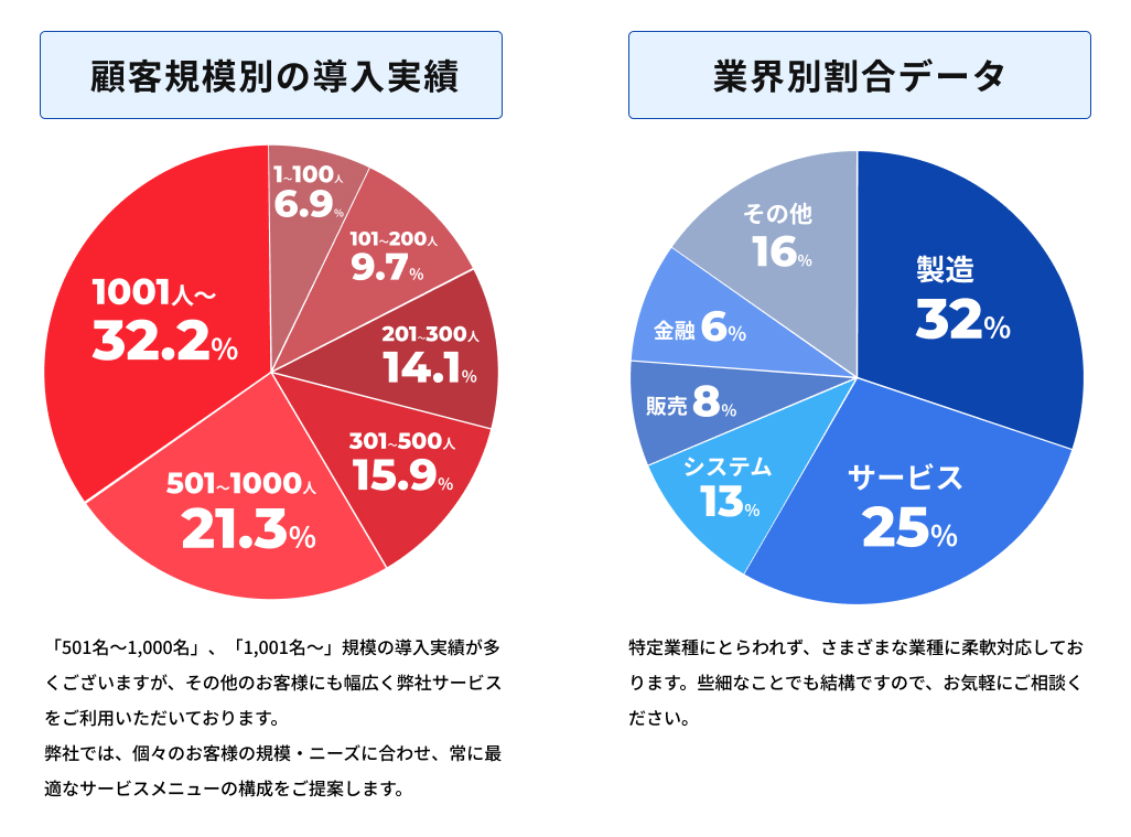 企業規模、業種に関わらず、幅広い企業様にご利用いただいております。あわせて、同業他社様から弊社のサービスに乗換いただくお客様は増加の傾向にあります。業務移管がゴールではなく、お客様の課題解決をゴールと考え、貴社の戦略や課題を考慮した柔軟な解決策をご提案します。その結果、目先のコスト削減にとらわれず、将来の経営戦略を見据えられるとのご評価をいただけている結果の表れでもあります。是非、一度、サービスに関してお問い合わせください。